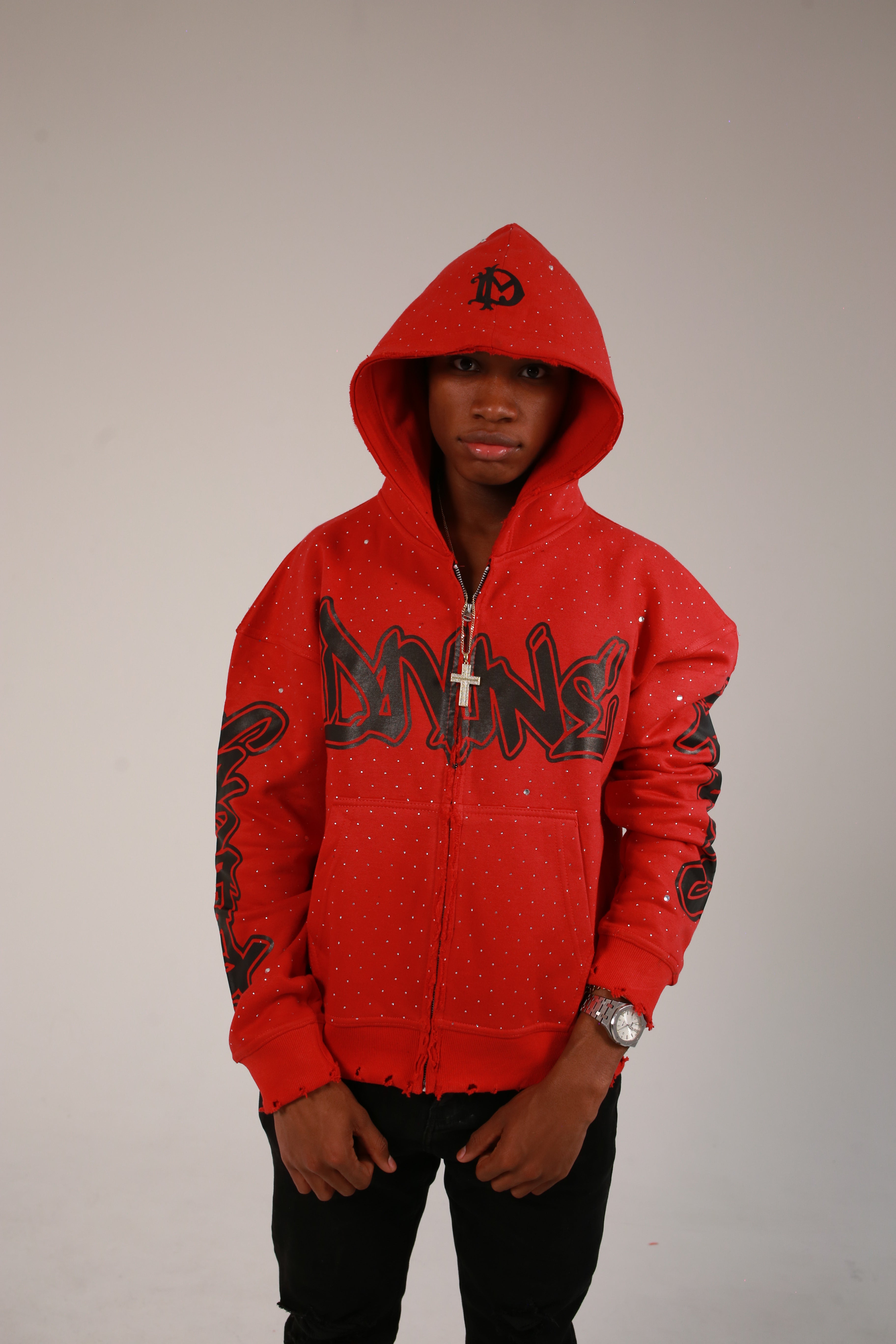 For those who refuse to blend in. The "Divine" Zip-Up in Crimson Flare takes our signature star-flecked wash and injects it with an aggressive, high-visibility red. Featuring distressed detailing and bold graffiti-inspired "DIVINE" typography, this piece is engineered to turn heads and dominate your rotation.